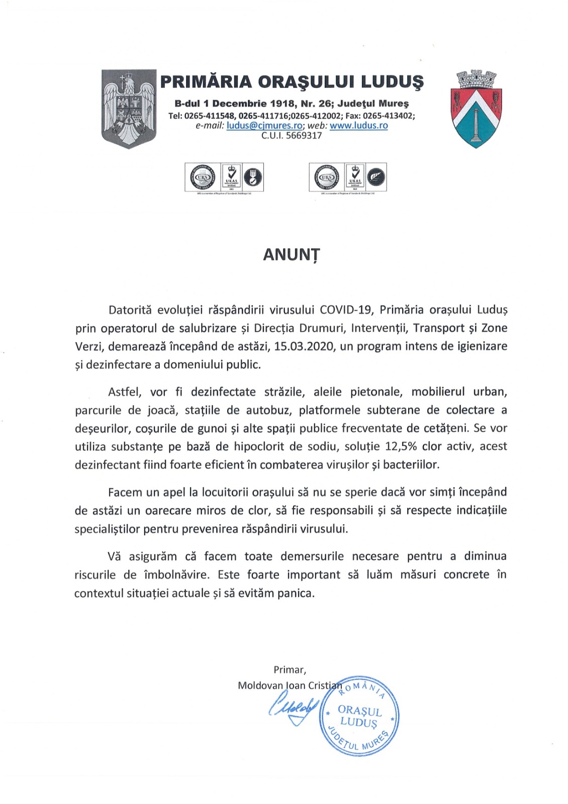Anunţ - program intens de igienizare şi dezinfectare a domeniului public.
