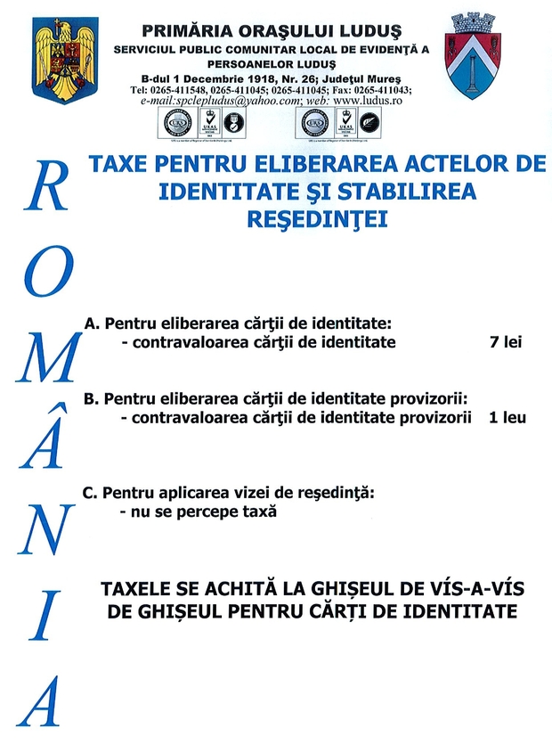 TAXE PENTRU ELIBERAREA ACTELOR DE IDENTITATE ŞI STABILIREA REŞEDINŢEI